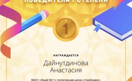Ученица 11 класса МАОУ "Лицей 11" (госпитальная школа школа "УчимЗнаем") Дайнутдинова Анастасия приняла участие в "Олимпиаде по русскому языку" и заняла 1 место! Поздравляем учителя Шевченко Татьяну Олеговну и Анастасию с прекрасным результатом! Желаем им дальнейших образовательных…