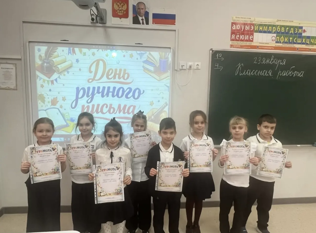 Спасибо нашим ученикам 1«В», 1«Д», 1«Ж», 1«Е», 2«Ж», 3«Д», 3«Ж», 4«В» и учителям — Шигаевой Наталье Александровне, Садовниковой Ольге Владимировне, Шутюк Юлии Андреевне, Кутовой Елизавете Михайловне, Молчановой Ольге Николаевне, Энукидзе Людмиле Мухтаровне, Погосян Нунэ Юриковне и Бессараб Наталье Юрьевне — за сохранение этой важной традиции, ведь почерк — зеркало характера.