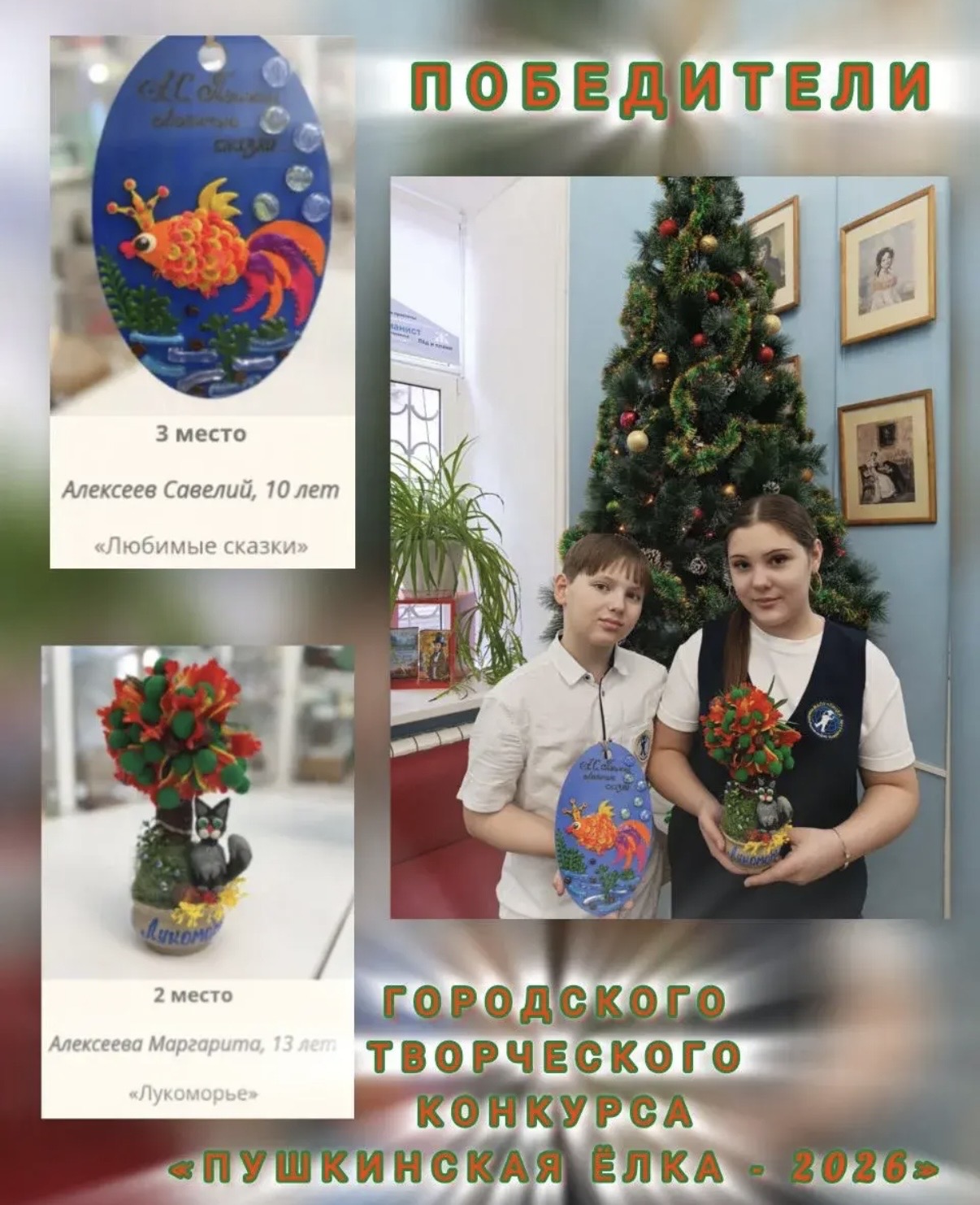 Поздравляем наших ребят, Алексееву Маргариту ученицу 7 «Э» класса и Алексеева Савелия 5 «Э» класса с победой в городском конкурсе «Пушкинская ёлка - 2026»!