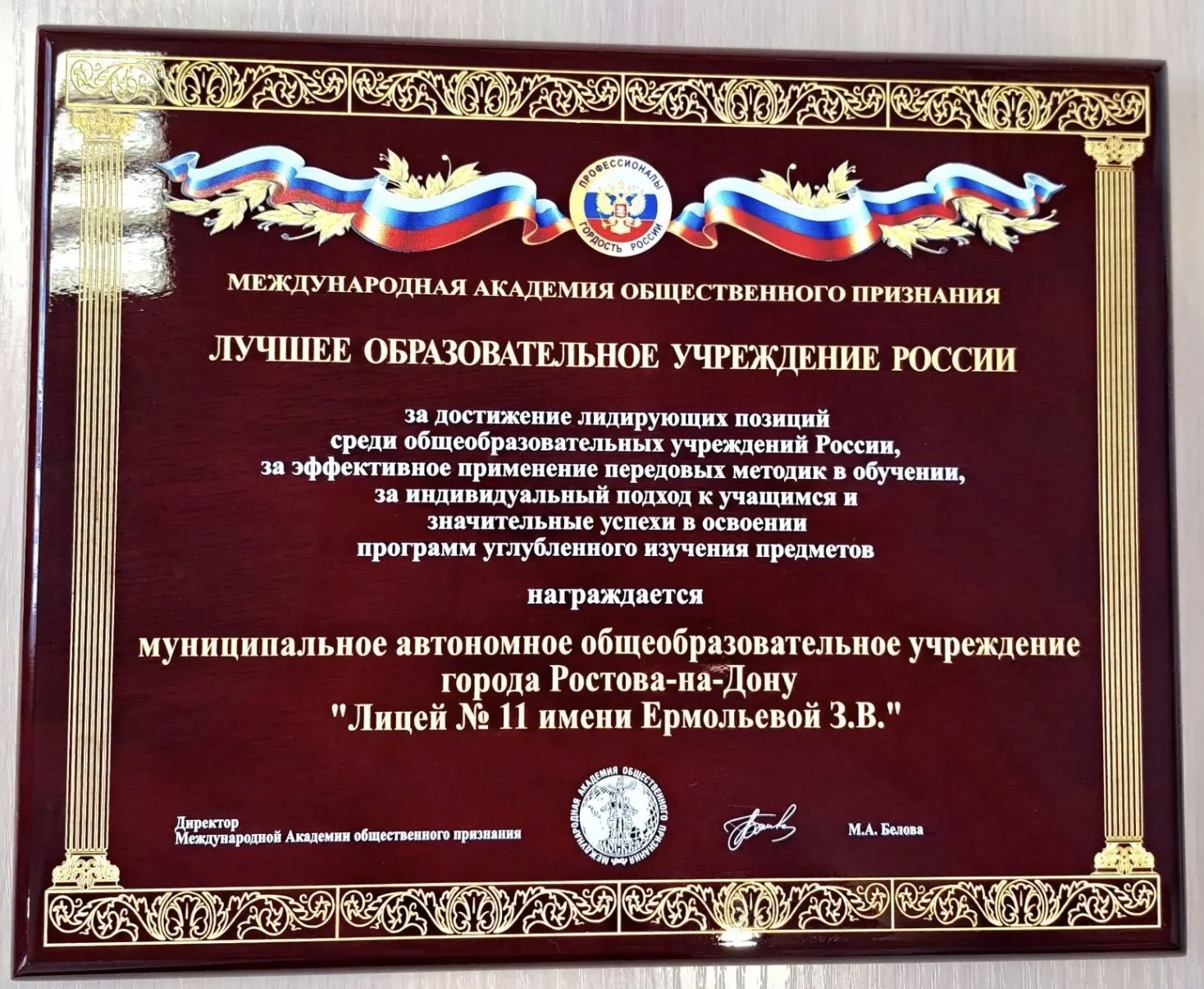С огромной радостью и гордостью сообщаем Вам замечательную новость! На основании профессионально-общественной экспертизы деятельности нашего лицея, проведенной Международной академией общественного признания (г. Москва), МАОУ «Лицей № 11 им. Ермольевой З.В.» удостоено почетного звания «Лучшее образовательное учреждение России».