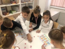 Ученики не только исполняли песню алфавита, но и выполняли задания по сопоставлению заглавных и строчных букв, а также собирали необходимые буквы для составления слов. Кроме того, ребята поиграли в домино, повторяя все изученные буквы