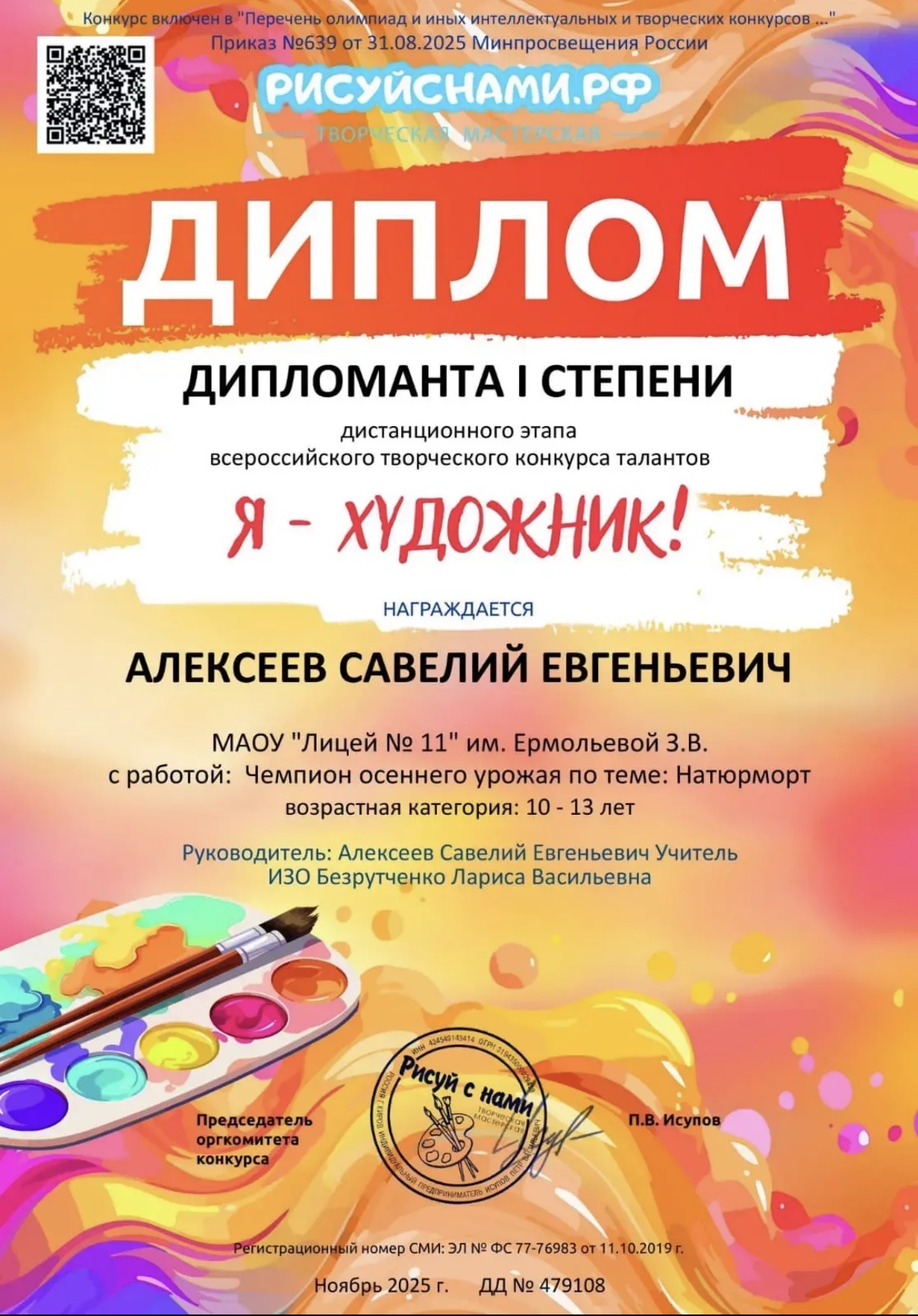 Поздравляем Безрутченко Ларису Васильевну и её ученика 5 «Э» класса Алексеева Савелия с победой! Желаем дальнейших успехов.