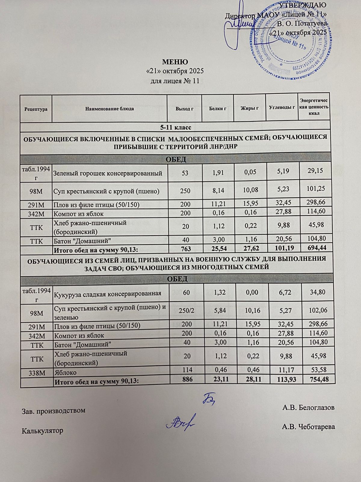 Меню на 21.10.2025г.