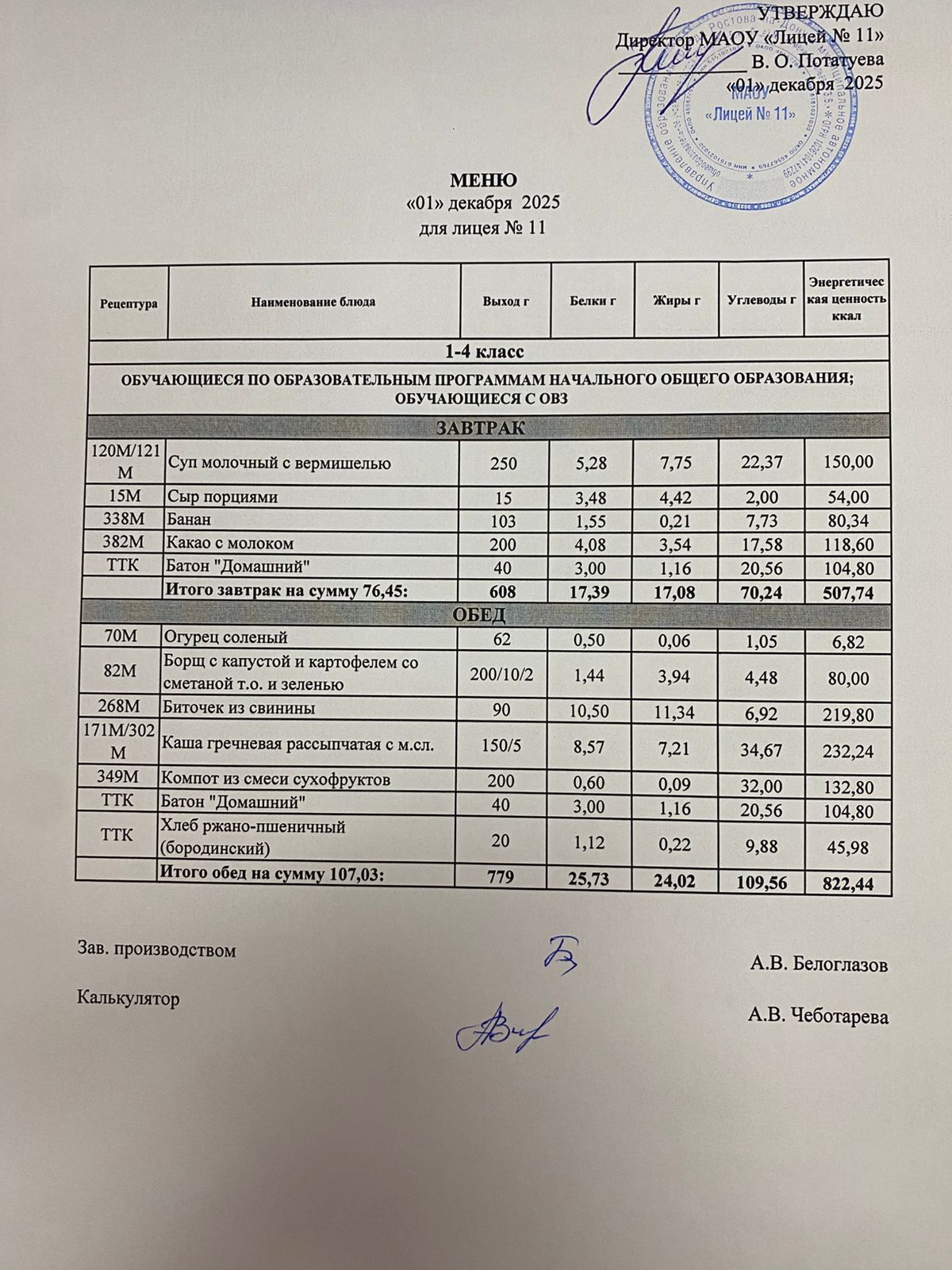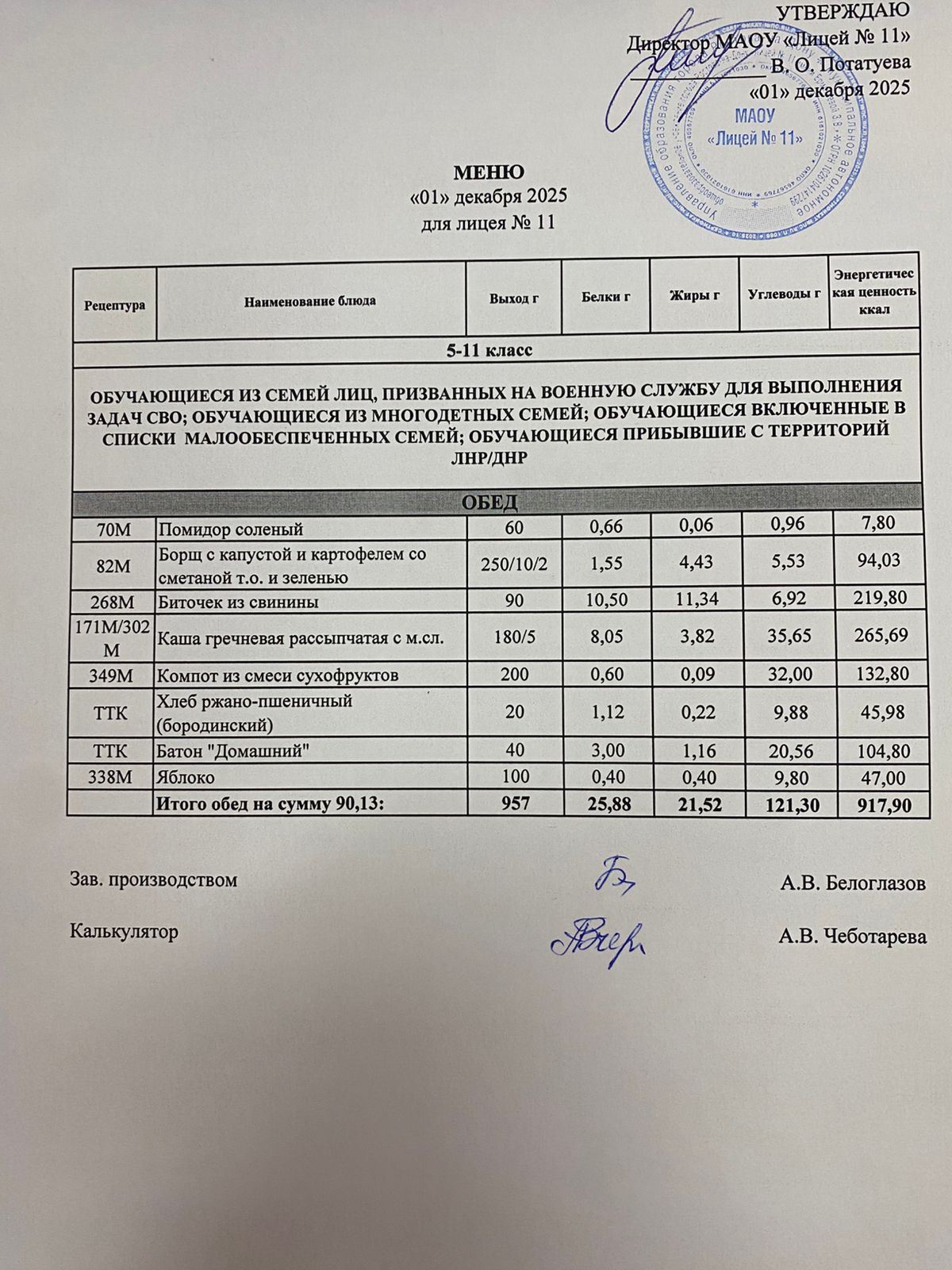 Меню для 5-11 классов на 01.12.2025г. для обучающихся с ограниченными возможностями здоровья (ОВЗ):