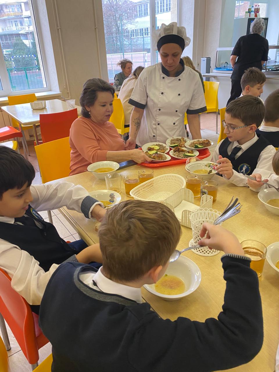 Ответ: Добрый вечер. Сегодня члены комиссии по проверке качества питания посетили столовые по вопросу организации горячего питания. При посещении, мы увидели размещенное на стенде 2-х недельное меню (размещено меню также и на странице официального сайта школы). Меню сегодняшнего дня 100% совпадает с указанным в 2-х недельном. За 15 минут до начала перемены сотрудник пищеблока приступила к накрыванию столов: расставила столовые приборы и салфетки, за 10 минут до начала перемены расставила на столы для детей горячий чай, а за 5 минут до прихода детей в столовую, приступила к накрыванию столов, расставляя порции еды. Нам удалось пообщаться с детьми, которые оценили качество еды. Отмечают, что очень вкусно готовят в лицее, еда разнообразная, не холодная, им предоставлена возможность приобретать выпечку в буфете. Качество еды в лицее ежедневно контролирует директор и заместители.