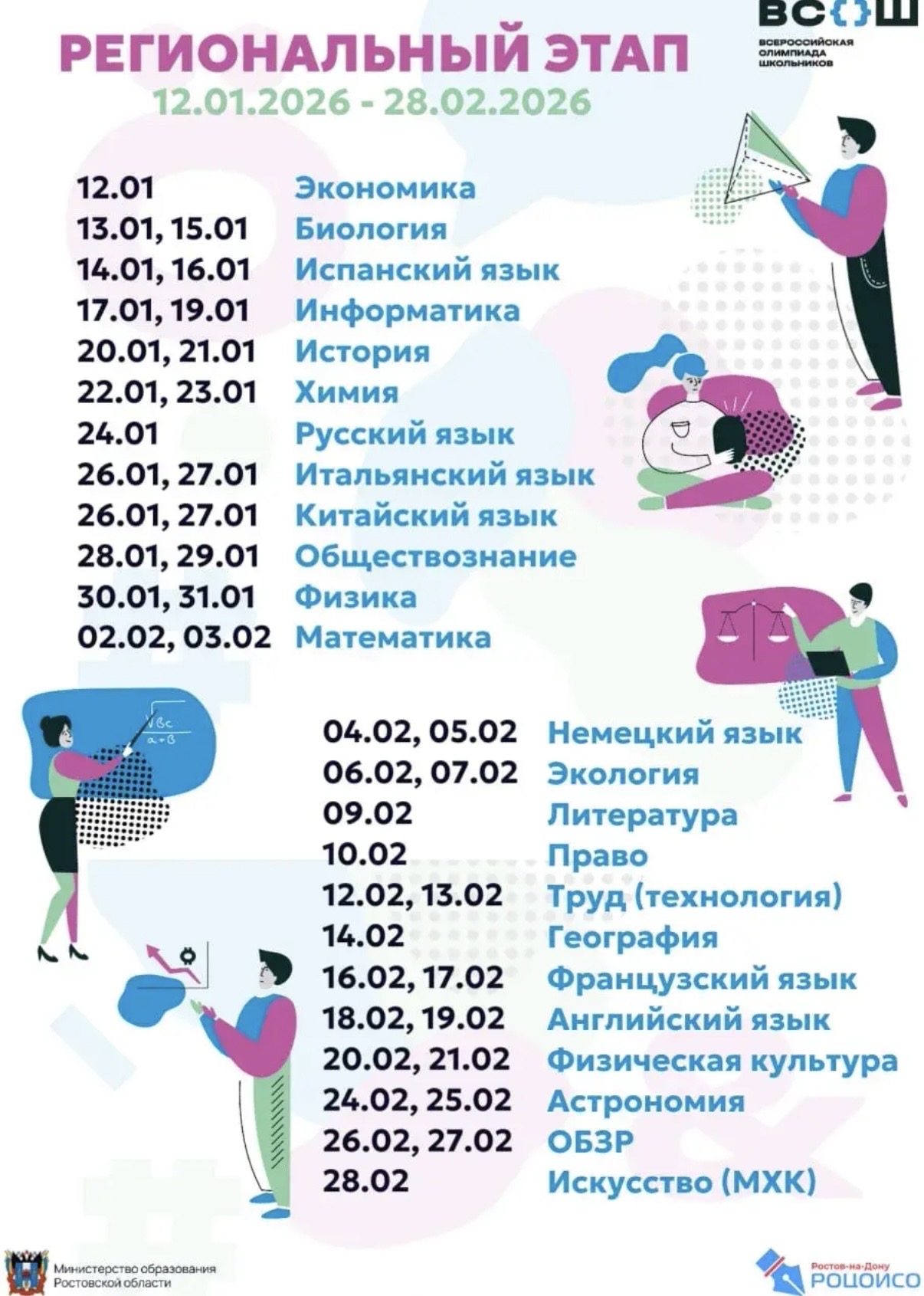Приказом Министерства просвещения РФ установлены сроки и график проведения регионального этапа всероссийской олимпиады школьников (далее РЭ ВсОШ). В 2025/26 учебном году РЭ ВсОШ пройдет по 24 предметам в период с 12 января по 28 февраля 2026 года.