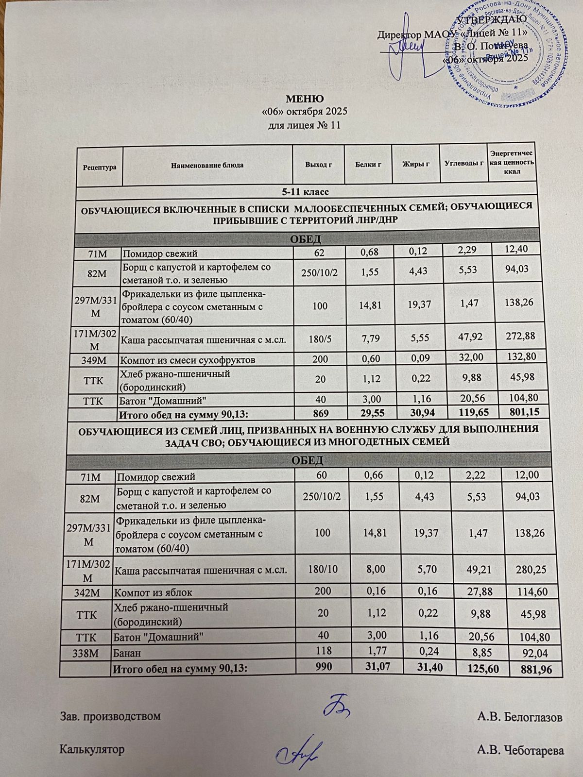 Меню для 5-11 классов на 06.10.2025г. для обучающихся с ограниченными возможностями здоровья (ОВЗ):