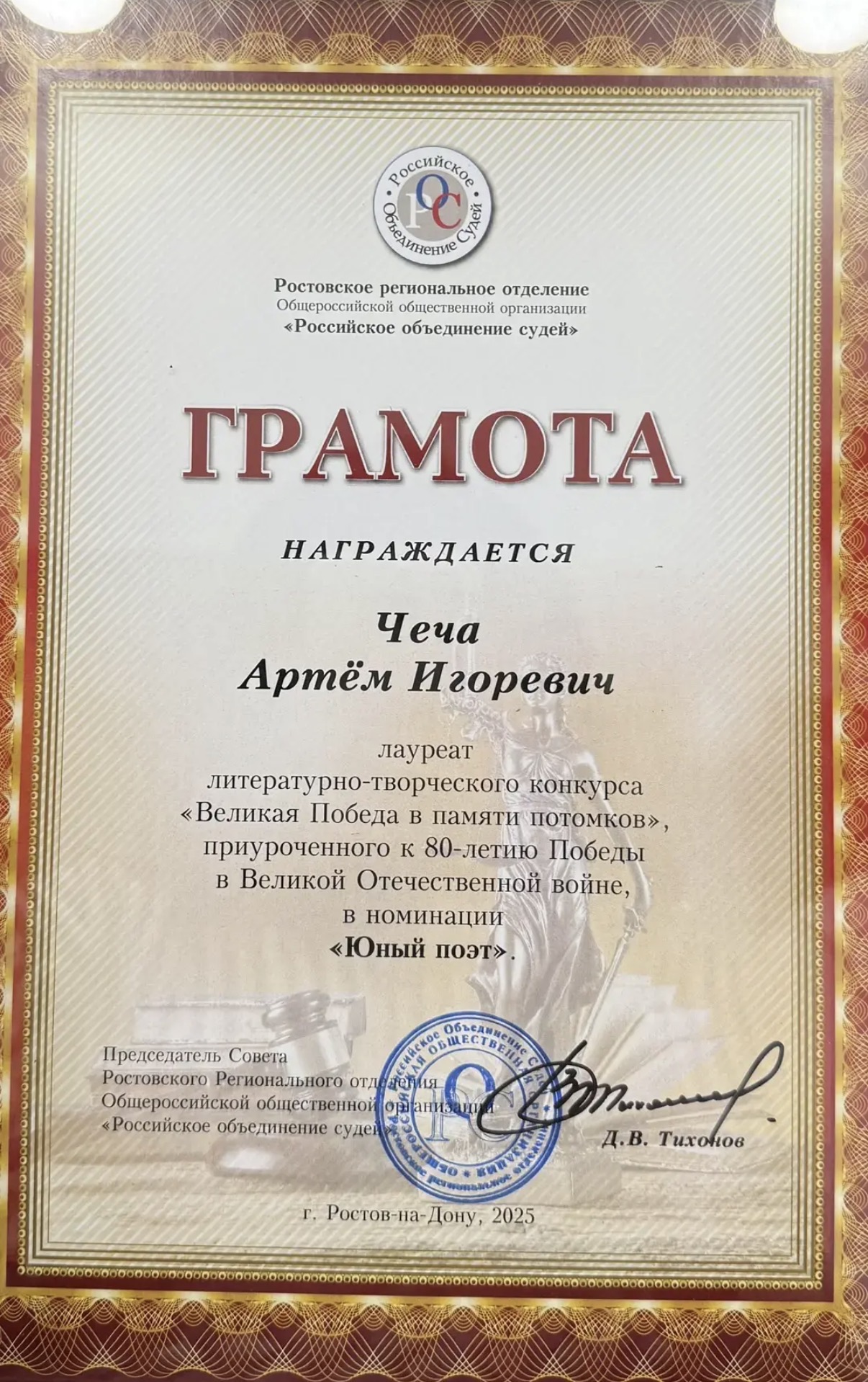 Лицеист 9«Б» класса Чеча Артём награждается грамотой лауреата литературно-творческого конкурса «Великая победа в памяти потомков», приуроченная к 80-летию Победы в Великой Отечественной войне, в номинации «Юный поэт».