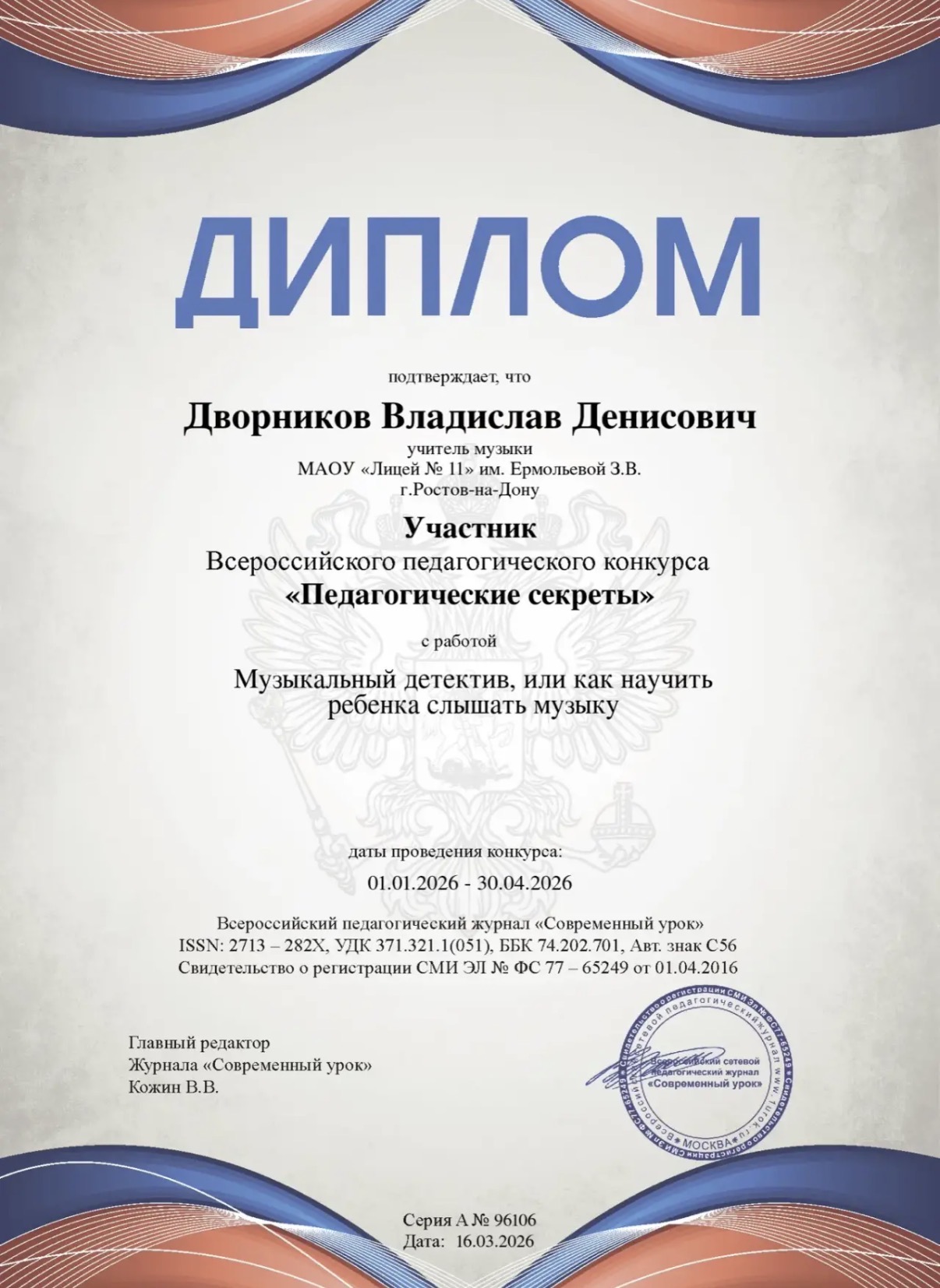 Учитель музыки МАОУ «Лицей № 11» им. Ермольевой З.В. — Владислав Денисович Дворников стал участником Всероссийского педагогического конкурса «Педагогические секреты» и представил авторскую работу «Музыкальный детектив, или как научить ребёнка слышать музыку».